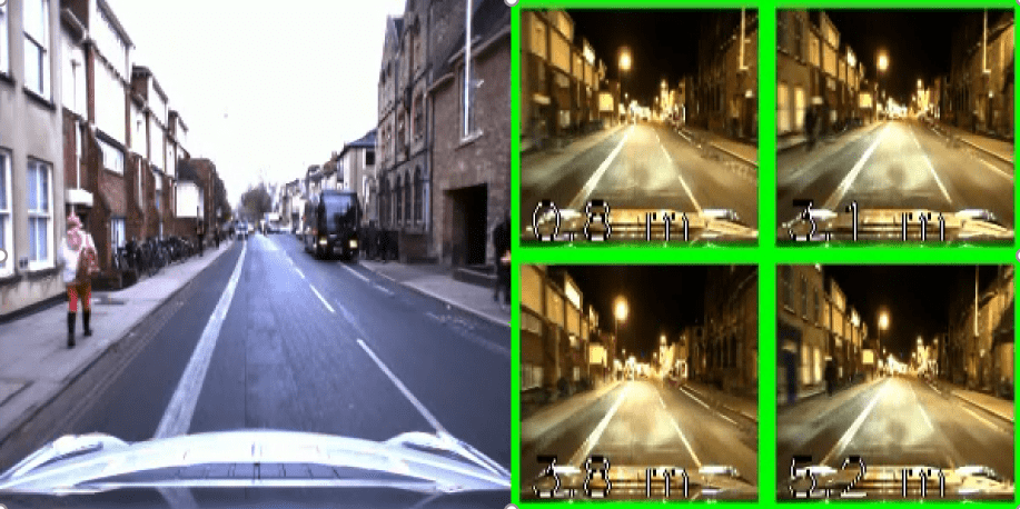 Figure 2. The demonstration of our 2D-VL method: Searching a day-time driving image (left) in a night-time image database of 19km constructed using our deep embedding space. The top 4 returned matched images (right) are all within 6 meters to ground truth (green highlighted).